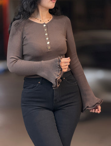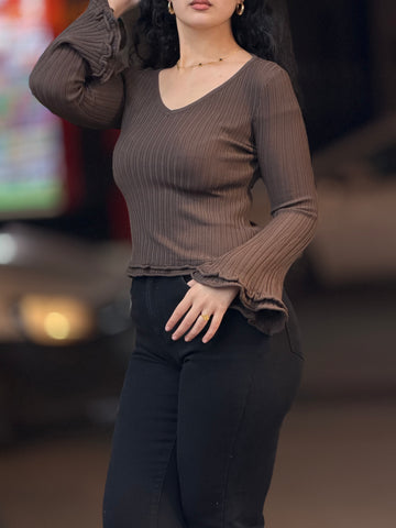 Ce pull bordeaux à manches et détails cloche apportera une touche élégante à votre garde-robe. Son col en V mettra en valeur votre décolleté tandis que le bas cloche ajoutera une touche de féminité. Fabriqué avec des matériaux de qualité, ce pull est à la fois confortable et chic. Portez-le pour une tenue chic et tendance.