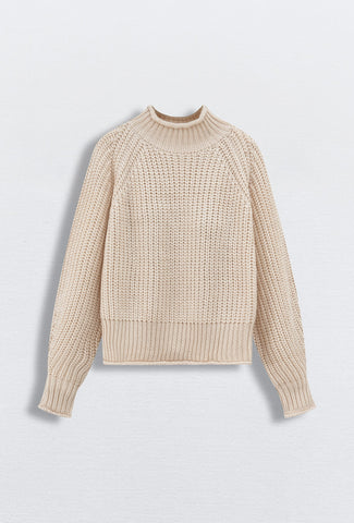 Une pièce essentielle au tricot aéré et structuré. Col montant côtelé, manches raglan et finitions soignées pour un tombé impeccable. La maille épaisse offre chaleur et caractère sans compromis sur la légèreté. Silhouette décontractée, facile à porter seul ou en superposition.