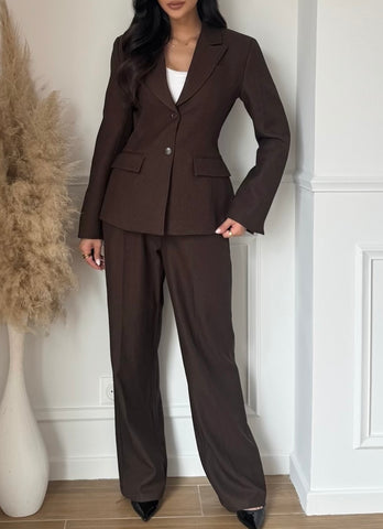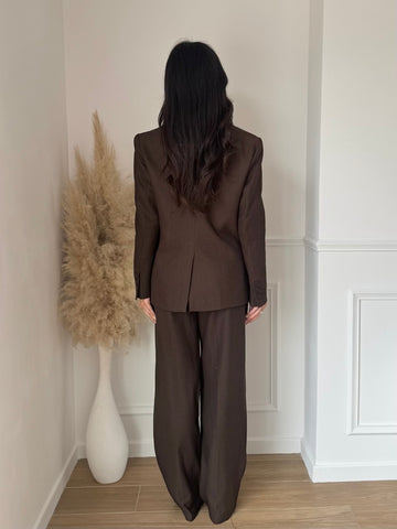 Le Blazer Gossip sur taille marron offre une silhouette ajustée et sophistiquée, imitant l’effet d'un corset. Doté de deux boutons et d'une doublure de haute qualité, ce blazer fabriqué en Italie allie élégance et confort, idéal pour des occasions formelles et professionnelles.